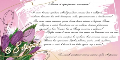 Милые и прекрасные женщины! Примите поздравление от коллектива Контрольно-счетной палаты города Мурманска.